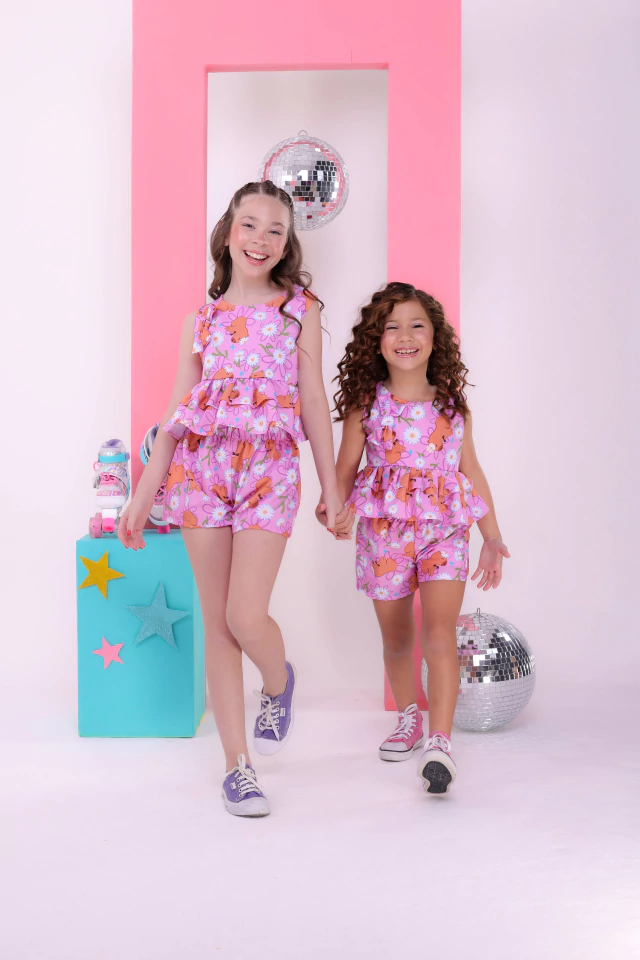 A blusa possui um detalhe de laço, com um shortinho que deixa o look um charme e versátil.